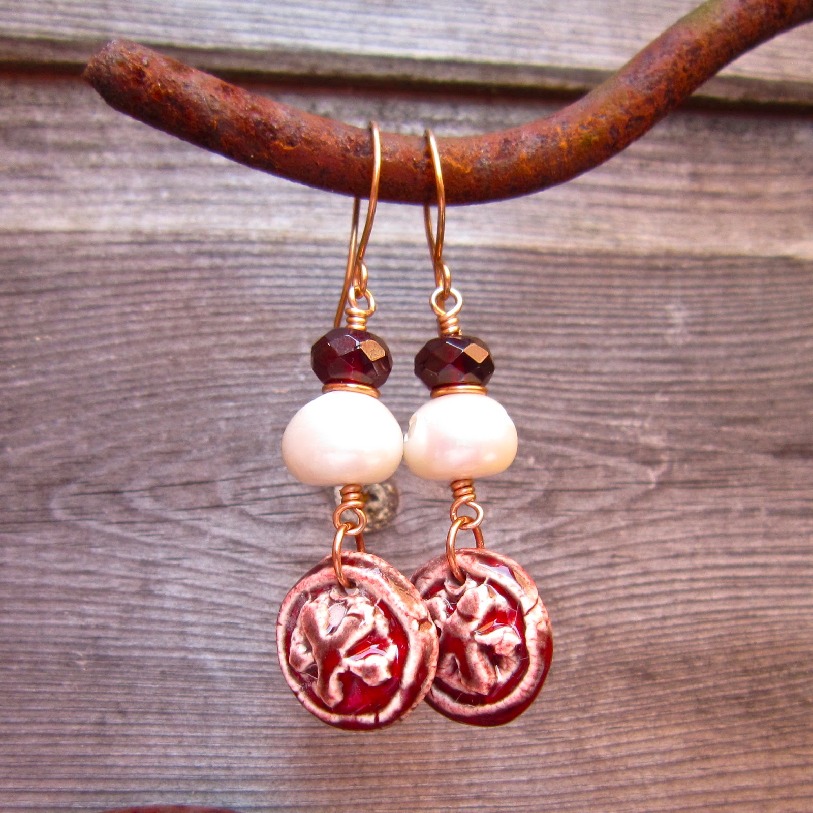 Having had a very hectic month with very little creative time I stuck with the easy option of making a pair of earrings. I love the contrast of the deep red and the milky white on jenny's charms and I wanted to keep an organic feel to my design so I went straight for my favourite chunky rustic pearls. I also found some faceted garnets which picked up the red nicely. A little wrapping with some bronze wire (I will oxidise these eventually but my LOS is at the bottom of a box somewhere between studios) and voila -nothing fancy but pretty none-the-less.