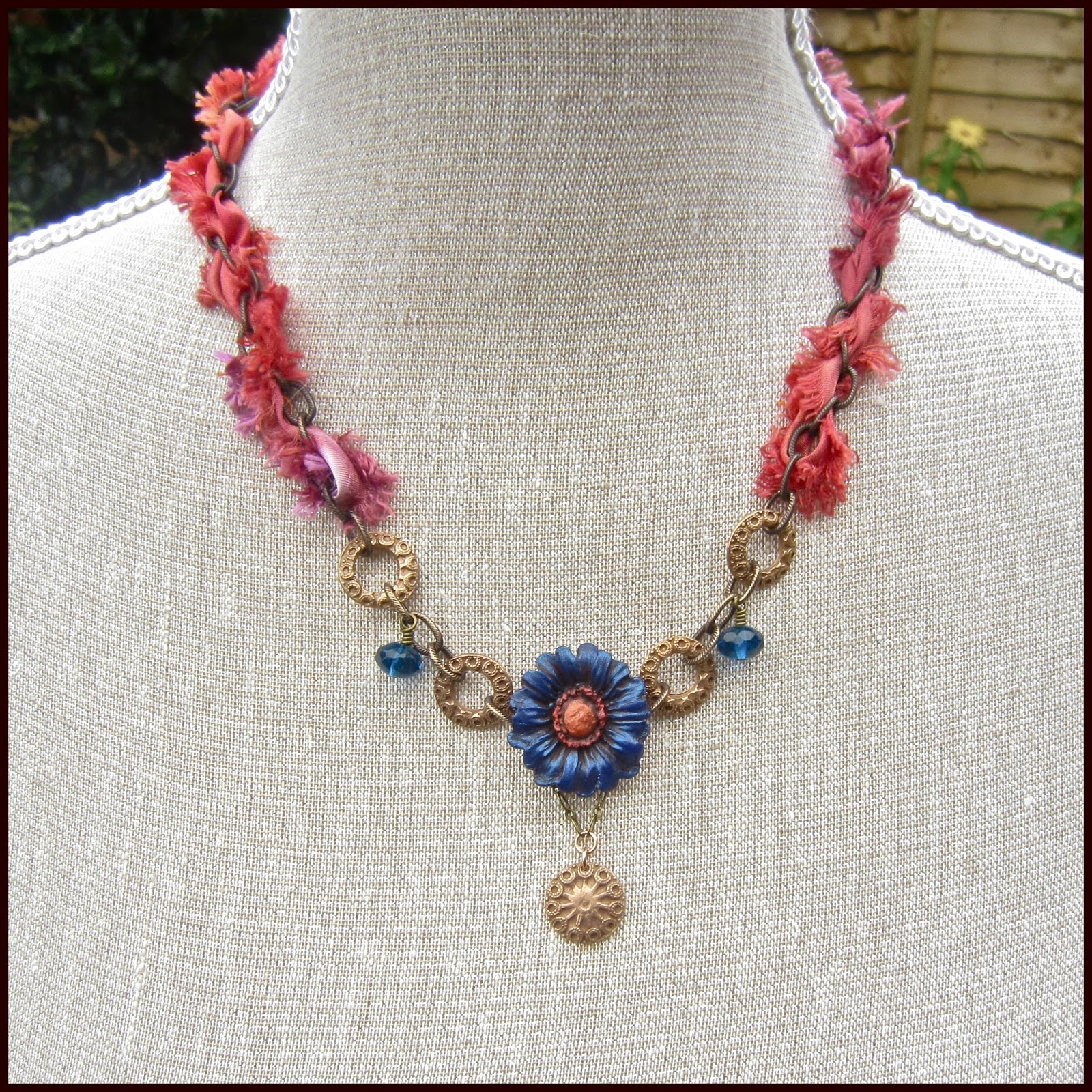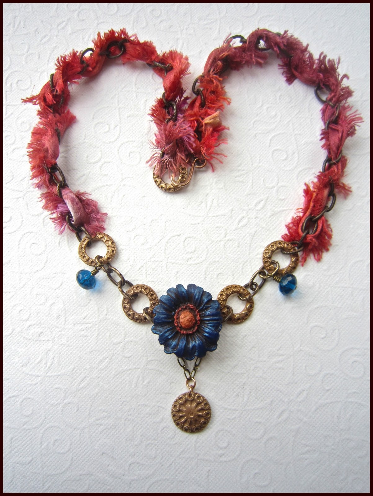 The thing that struck me about this painting is how dominant the rich and sumptuous textiles are in the composition and I wanted to try an evoke something of this in my design. I decided on a necklace using the focal bead and started with one of Diane Turton's 'Raggy Ribbons' which matched perfectly with the deep brick reds. The ribbon is quite wide and when threaded through a heavy Vintaj chain it gave a lovely shaggy effect.