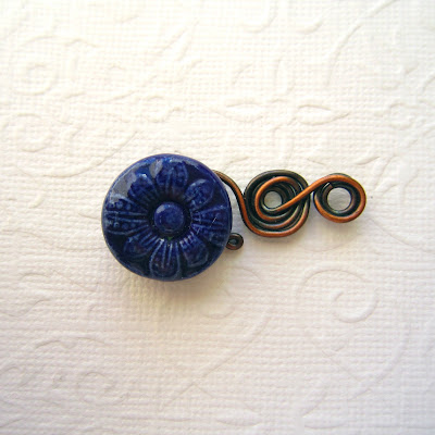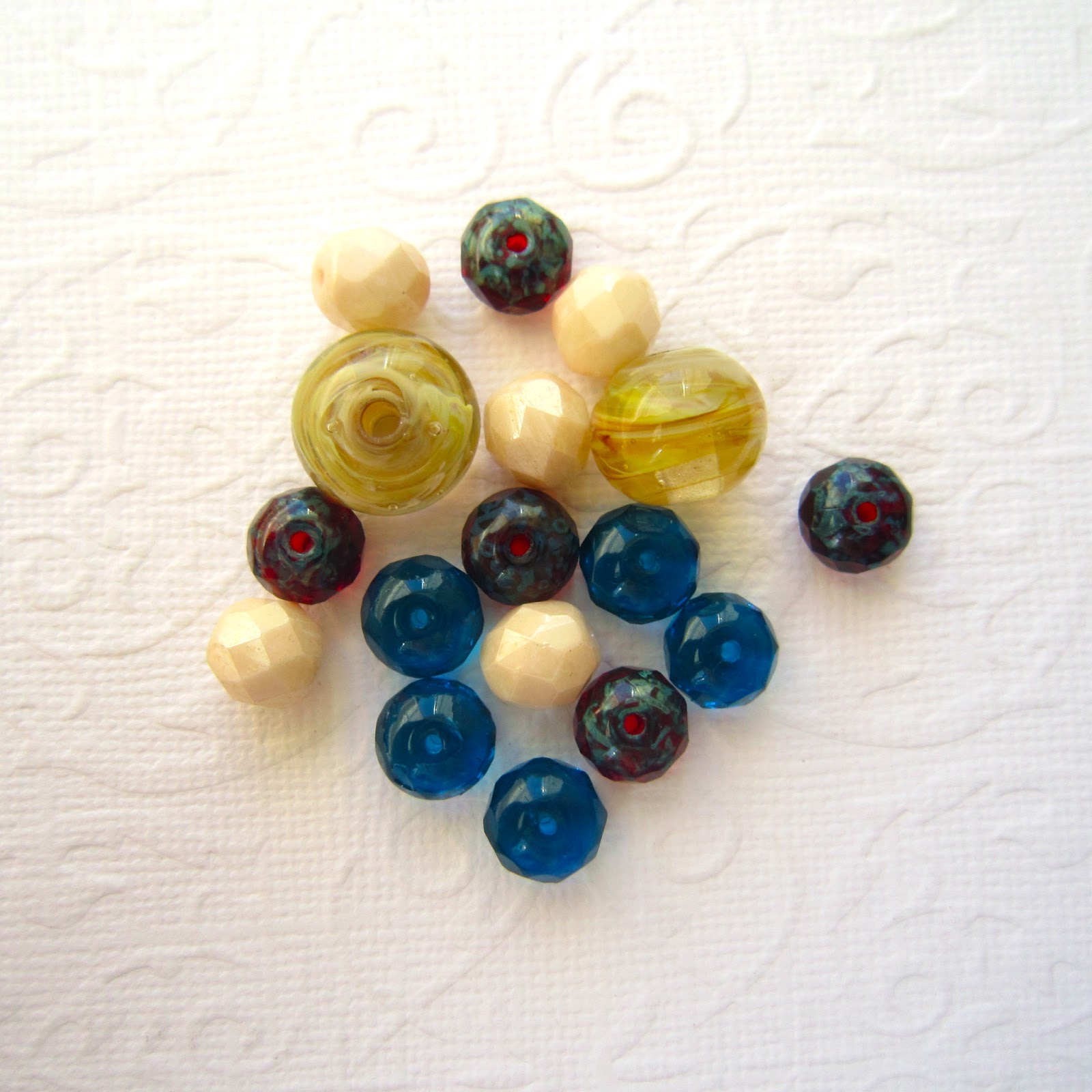 So then - how to use the clasp...? I decided this would work well in a bracelet with some of my favourite rustic pearls which bring to mind the lovely soft skin tones of the painting. I used Rebecca's blue waxed linen to string the pearls and interspersed them with tiny faceted red beads and the lovely gold lampwork beads Jo included with her accent beads. To counterbalance the clasp I also added a gorgeous lampwork bead by Helen Chalmers in the same blue with dots of cream and brick red. I finished the piece with two little red glass beads and one of my blue bronze hearts - she has just been jilted after all. I do really like this - I don't think I would normally have thought to put these colours together and simple as it is I think it works well.