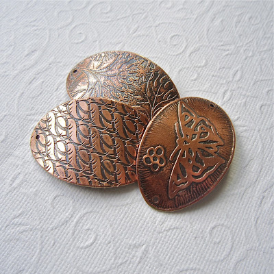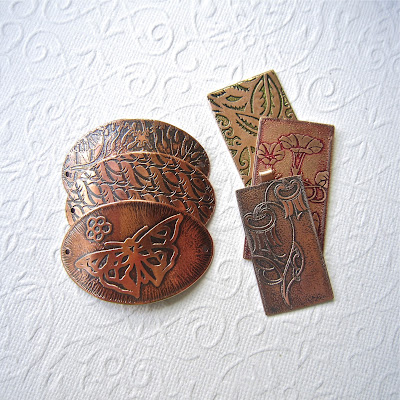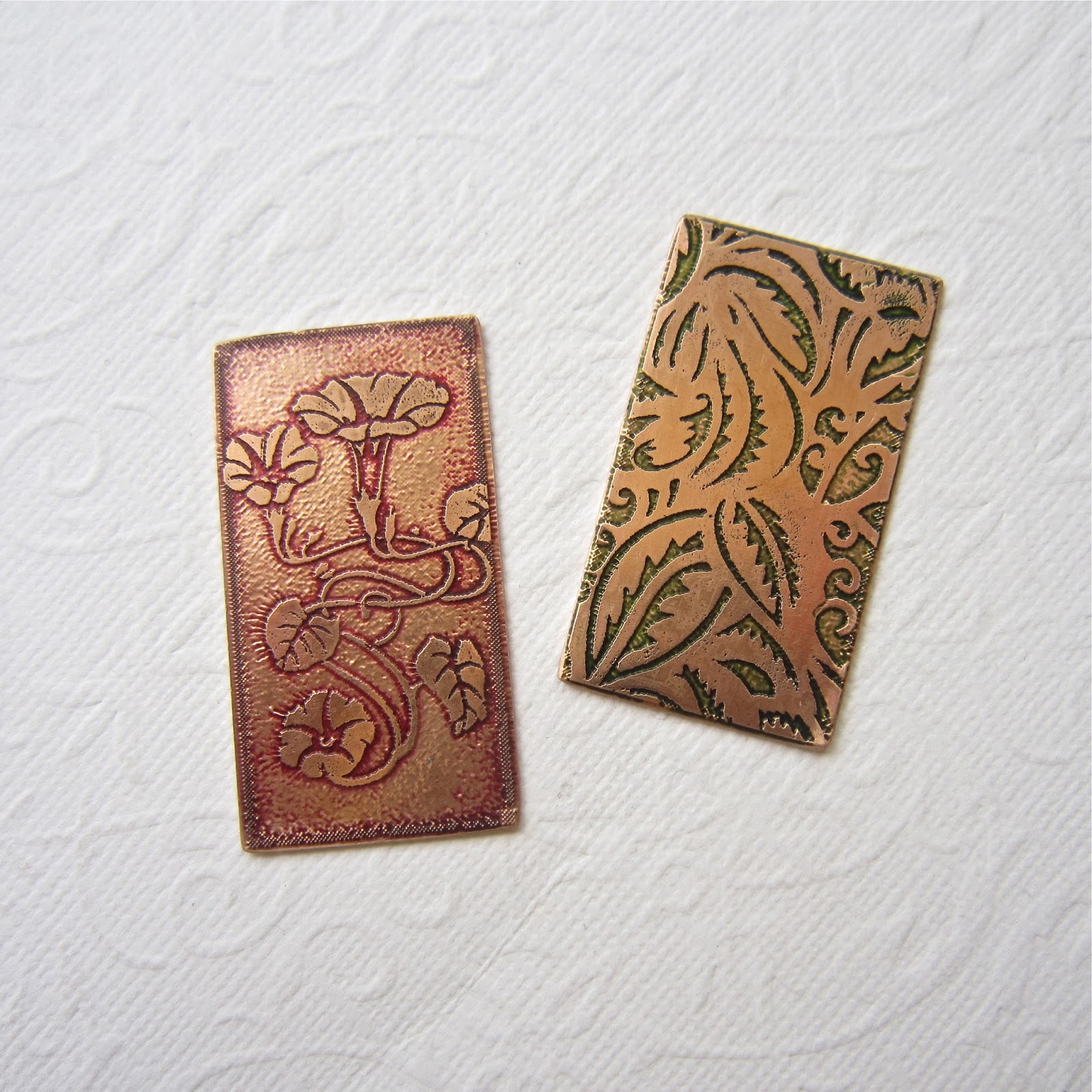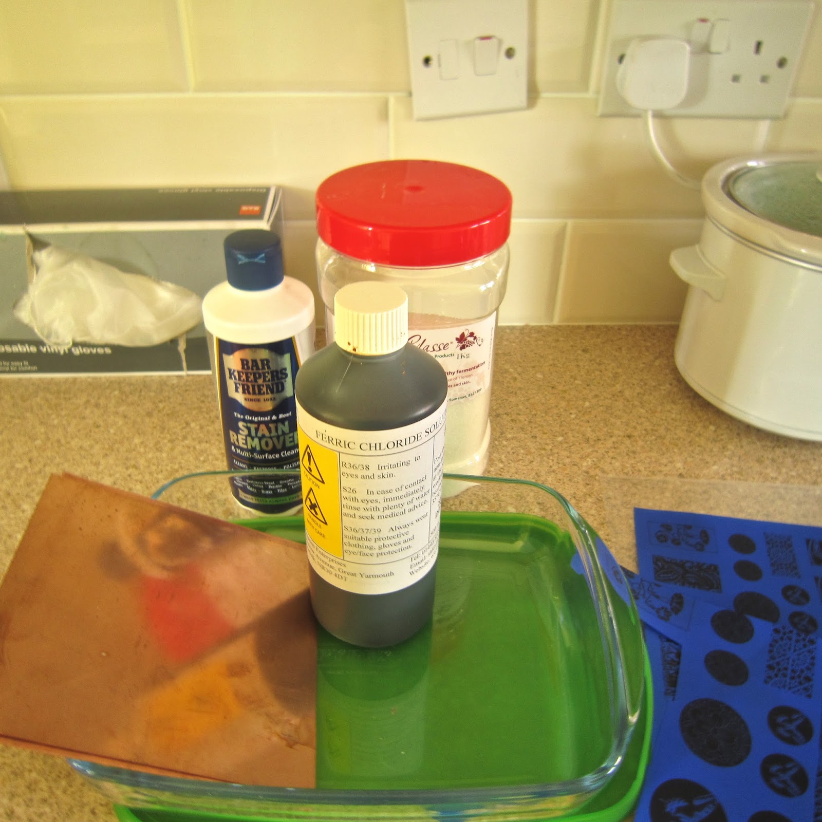 I've been working with copper sheet and using 'Edinburgh Etch' which is a mix of Ferric Chloride and Citric Acid. As it's been a while since I did this I decided to just repeat some of the things I'd done on the course to refresh myself on the process, before trying anything new...as always I have a myriad of ideas in my head!