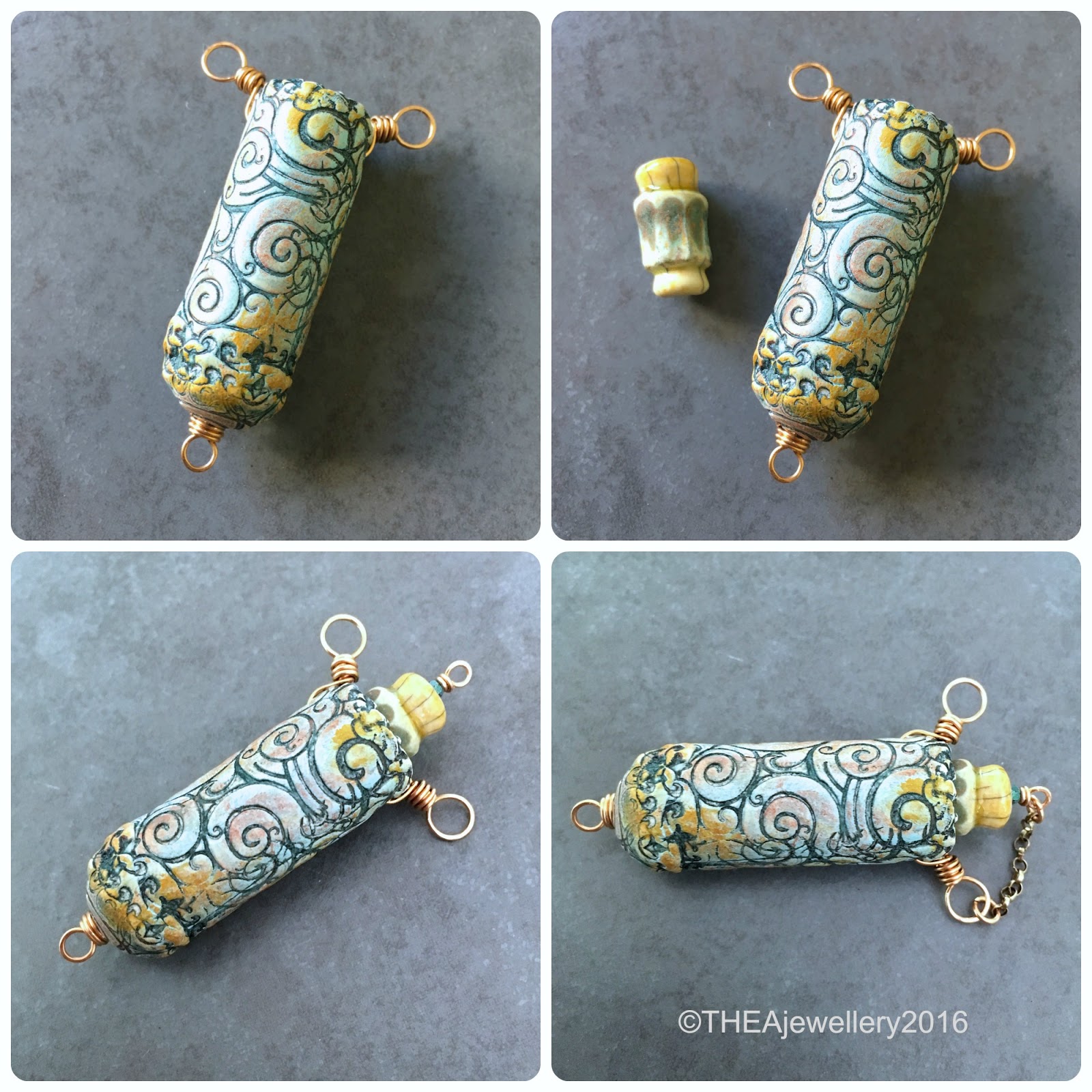 Today is reveal day for the AJE Component of the Month challenge for April and the pieces we had to work with this month were these wonderful polymer clay Amulets created by Jenny Davies-Reazor. I was lucky enough to get the gorgeous green swirly one at the bottom left of this image.