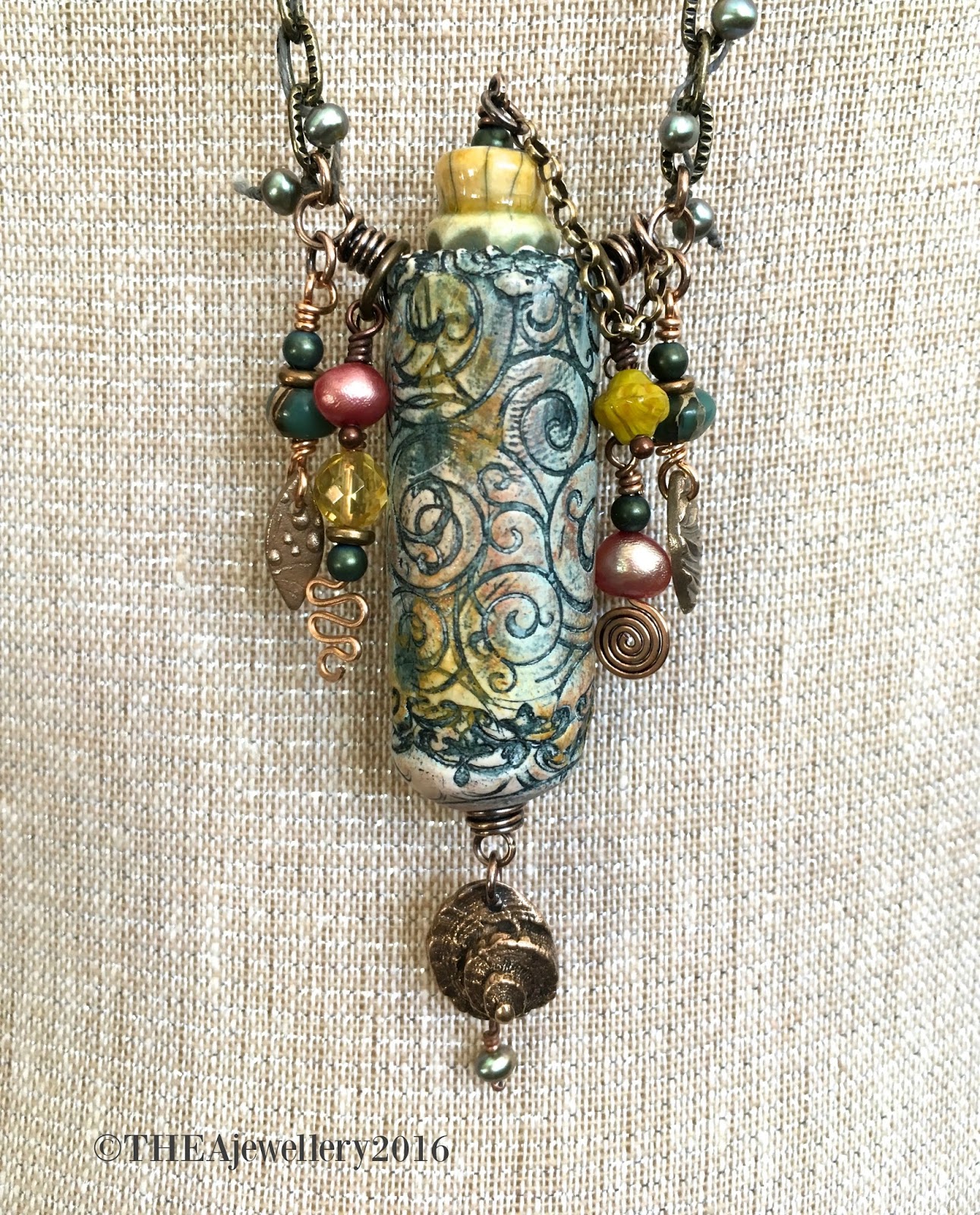 At this point I felt I needed to add some embellishment for a bit more impact. I was thinking of this necklace as something a mermaid would wear to keep her treasures close so I added a cluster of dangles made up from bronze charms, pearls, Citrine, Ocean Jasper and Czech glass, all of which pick up the subtle tones of the amulet. I'm still thinking about what to put inside the amulet...